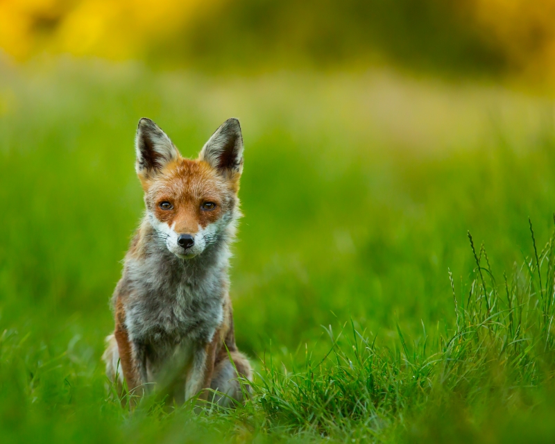 Lištička v trávě. Vhodné na šířku nebo jako čtverec.