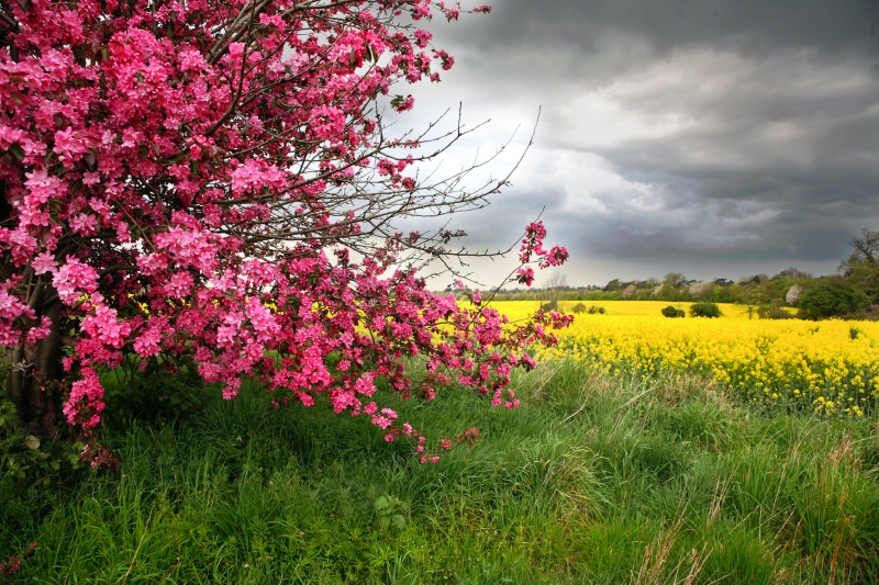 Rozkvetlý strom u žluté louky
